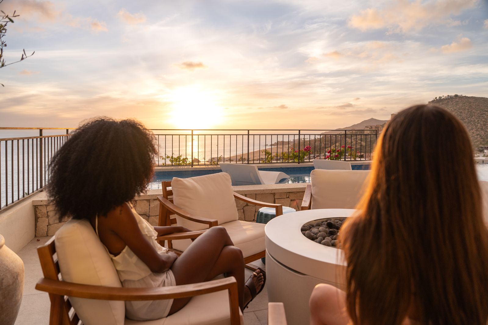 Infinity pool with a firepit on the main terrace—your perfect spot to unwind as you take in breathtaking sunsets and the soothing Pacific breeze.